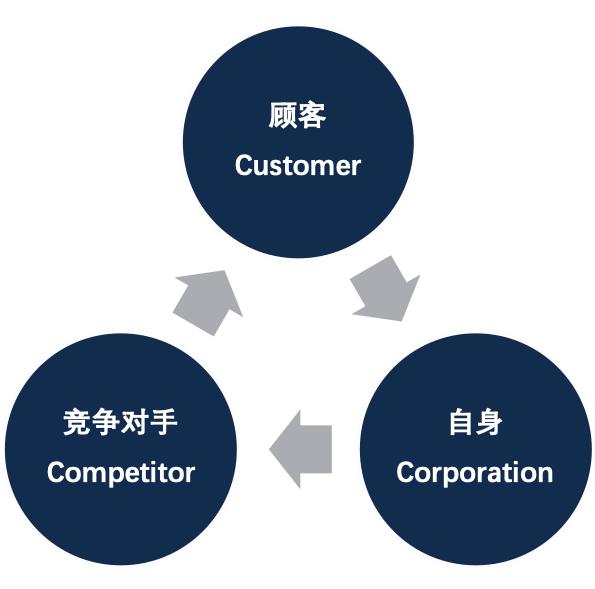 任何经营战略的构想均须考虑三个主要角色;即公司本身、顾客和竞争对手。此“战略三C”中的每一个都是活生生的实体,都有自身的兴趣和目的。我们将其合称为“战略三角形”。